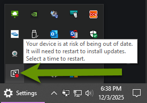 For this specific attack, it is helpful to know the three locations where the operating system will notify you of potential updates. First, you may see these notifications in the form of a popup from the bottom right corner of the taskbar in the system tray that updates need to finish installing.