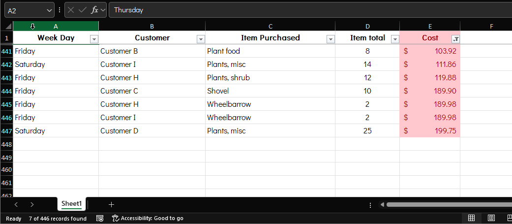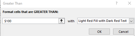 In my spreadsheet, I have created a conditional formatting rule that will color fill all cells where the total cost is greater than $100.