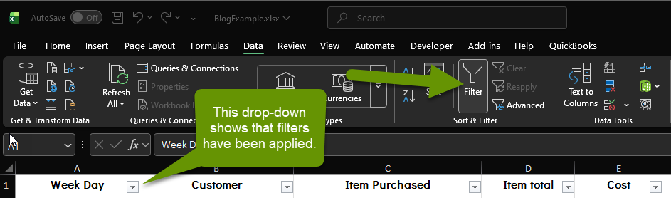 Next you need to enable filtering so you can filter by color-filled cells. To enable filtering, select the row that has your data headings and click on "Filter" in the Data tab.