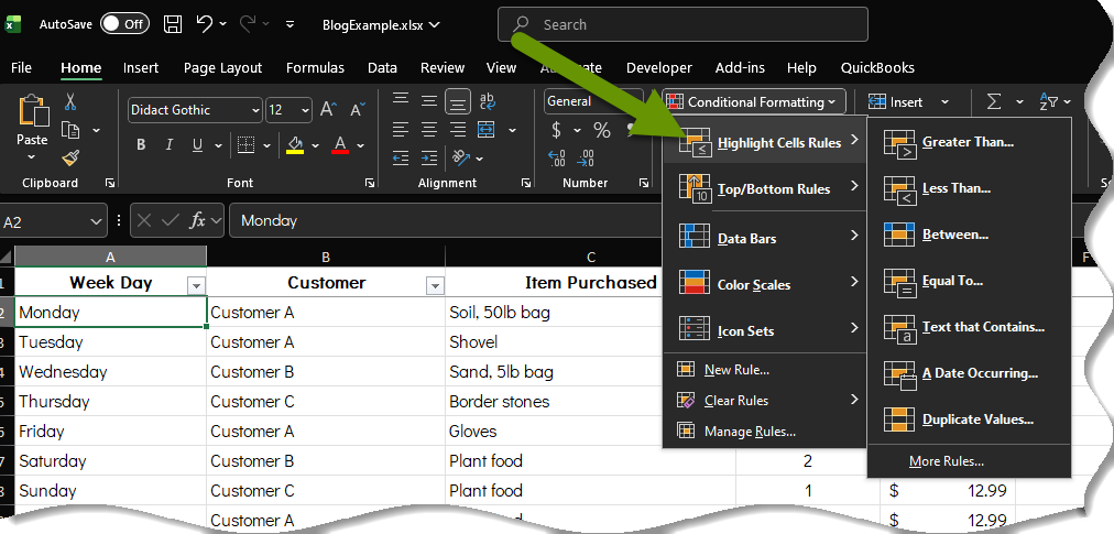 For a walk through on how to apply conditional formatting, check out this former post Using Conditional Formatting to Identify Date-Based Patterns in Excel which is also available as a video. Once you have applied a conditional formatting rule, which uses color-filling and/or text colors to identify the cells that meet the specific criteria, you can filter for these cells by their filled color which is an efficient way to filter.