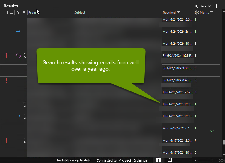 Outlook can be a great application for managing email, tasks, your calendar and more. However, in recent years, updates have included changes to the default period emails stay in your local Outlook application. The amount of time emails are kept is configured in the retention setting. Originally, retention was set to all by default, meaning keep emails for all of time, unless changed by the tech person managing the settings. In the last few years, regular software updates to Outlook have changed the retention setting to a new default of one year. This is noticeable when you try to locate an older email and it has to be downloaded from the mail server.