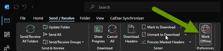 - You can verify you are working offline by checking the status in the lower corner of Outlook.